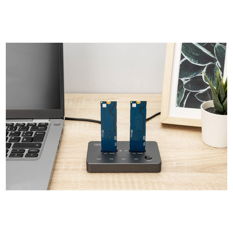 The DIGITUS® Dual NVMe Docking Station DA-71545-1 offers a powerful storage solution for IT professionals and enthusiasts. With space for two M.2 NVMe SSDs (up to 4 TB per slot), it enables high-speed data transfers and an integrated offline cloning function that allows easy duplication of data carriers at the touch of a button."