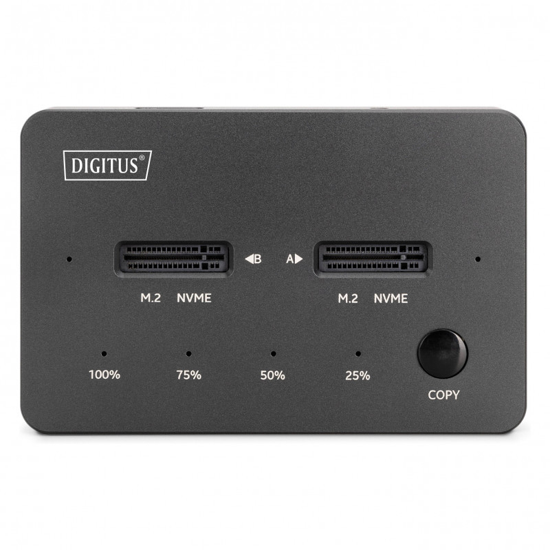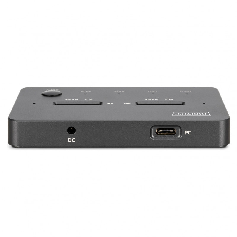 "Digitus NVMe cloning station USB3.1 Gen2 Type-C NVMe M.2 SSD enclosure. Storage media type: SSD, Storage drive interface: M.2, Storage drive sizes supported: M.2. Host interface: USB 3.2 Gen 1 (3.1 Gen 1) Type-C. Product colour: Black, Maximum data transfer rate: 10 Gbit/s. AC input voltage: 100 - 240 V, AC input frequency: 50/60 Hz, Input voltage: 5 V. Width: 79 mm, Depth: 77 mm, Height: 18 mm"\n"Manage M.2 NVMe and M.2 SATA SSDs via a USB-C™ connection