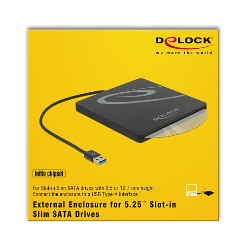 "DeLOCK 42604. Size (imperial): 13.3 cm (5.25""), Optical drive interface: SATA III. Chipset: Initio INIC-3619, Maximum data transfer rate: 5 Gbit/s, Power source type: USB. USB version: 3.2 Gen 1 (3.1 Gen 1), USB connector type: USB Type-A. Product colour: Black, Housing material: Plastic. Width: 139 mm, Depth: 143 mm, Height: 16 mm"\n"Delock External Enclosure for 5.25″ Slot-in Slim SATA Drives 9.5 / 12.7 mm to USB Type-A male black