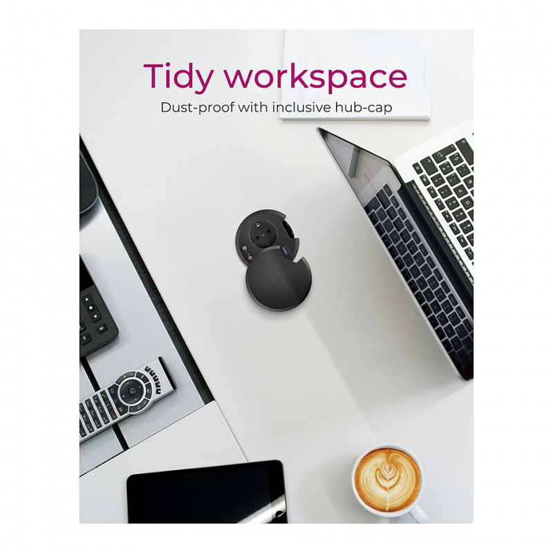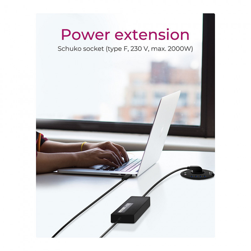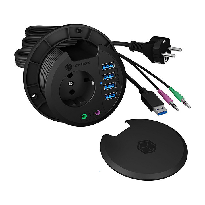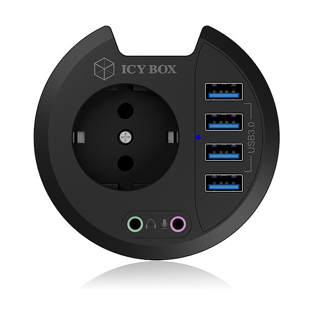 "ICY BOX IB-HUB1430. Product colour: Black, Housing material: Plastic. Power plug type: Type F (CEE 7/4). Width: 80 mm, Depth: 800 mm, Height: 550 mm. Quantity per pack: 1 pc(s), Package width: 115 mm, Package depth: 115 mm. Country of origin: China, Master (outer) case width: 610 mm, Master (outer) case length: 500 mm"\n"The IB-HUB1430 is the elegant solution for a tidy desk. It fits into existing holes (80 mm), is mounted without tools and offers enough space to feed several cables through."