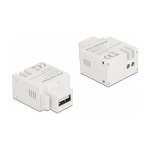 "DeLOCK Keystone Module USB Type-A Charging Port 2.1 A white. Construction type: Flat, Product colour: White, Connector 1: USB A. Width: 20.7 mm, Depth: 44.8 mm, Height: 32.5 mm. Quantity per pack: 1 pc(s)"\n"This module by Delock provides a USB Type-A charging port. With its standardised dimensions it can be used for easy snap-in mounting in e.g. a Keystone patch panel, face plate or surface-mount box."