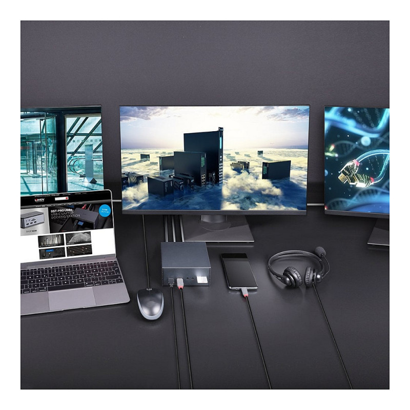 "Lindy DST-Pro 101, USB-C Laptop Docking Station with 4K Support and 100W Power Supply. Connectivity technology: Wired, Host interface: USB 3.2 Gen 2 (3.1 Gen 2) Type-C. Ethernet LAN data rates: 10,100 Mbit/s. Product colour: Grey, Compatible memory cards: MicroSD (TransFlash), SD, Data transfer rate: 5 Gbit/s. Power source type: DC, Power consumption (typical): 25 W. Width: 122 mm, Depth: 122 mm, Height: 55 mm"\n"The DST-Pro 101 was designed with pros in mind, this product allows for easy, fast, and reliable charging of your device, ensuring you can perform power-hungry tasks with ease. Housed in a robust aluminium body, this dock has been constructed to provide elite performance.