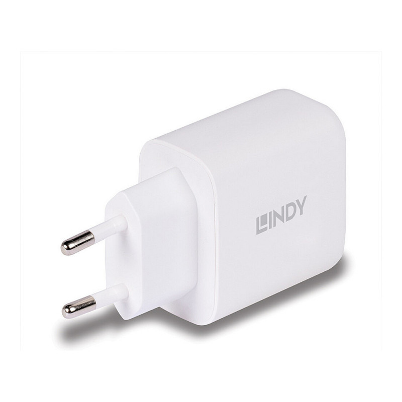 "Lindy 73428. Charger type: Indoor, Power source type: AC, Charger compatibility: Universal. Input voltage: 100 - 240 V, Maximum output voltage: 20 V. USB 2.0 ports quantity: 1, USB Type-C ports quantity: 1, Fast charging, Power protection features: Over current, Over voltage, Overheating, Short circuit. Product colour: White"\n"The Lindy 65W USB Type A & C GaN Charger can charge two devices simultaneously. 65W Power Delivery and PPS are supported by the USB Type C port while the USB Type A port provides fast charging with up to 45W. When both ports are used in parallel a maximum power of 20W will be provided.