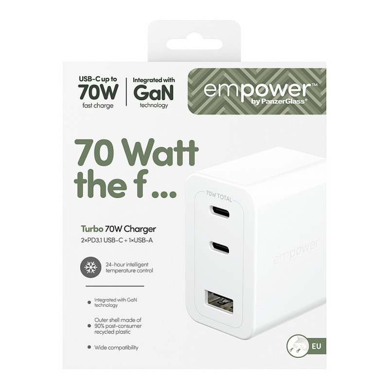 "PanzerGlass empower™ by ® Turbo 70W Multiple Charger incl. 2 x USB-C + USB-A | EU Plug | Silver White. Charger type: Indoor, Power source type: AC, Charger compatibility: Smartphone, USB Type-C ports quantity: 2, Fast charging, Power protection features: Overheating. Product colour: White"\n"FAST CHARGE