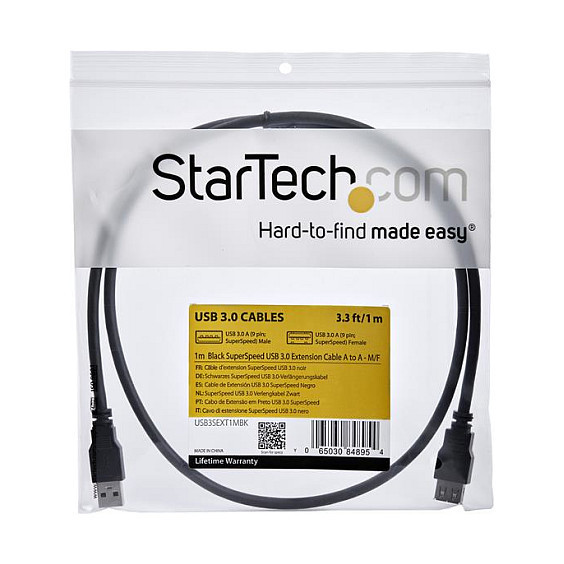 "StarTech.com 1m Black SuperSpeed USB 3.0 Extension Cable A to A - M/F. Cable length: 1 m. Connector 1: USB A, Connector 2: USB A, USB version: USB 3.2 Gen 1 (3.1 Gen 1), Maximum data transfer rate: 5 Gbit/s, Connector contacts plating: Nickel, Product colour: Black"\n"Extend your SuperSpeed USB 3.0 cable by up to an additional meter