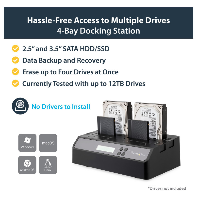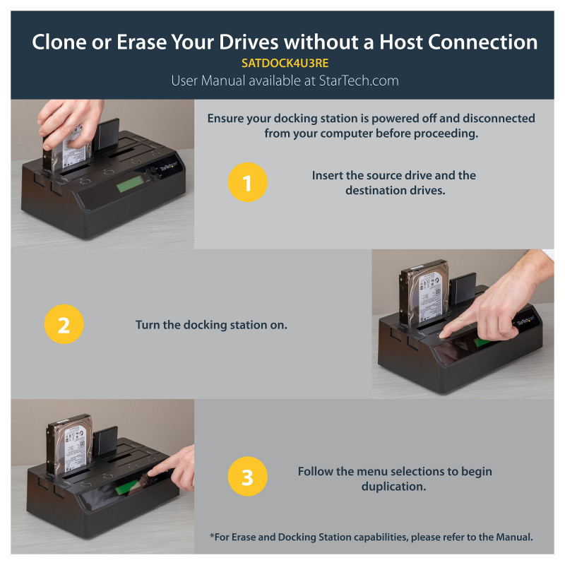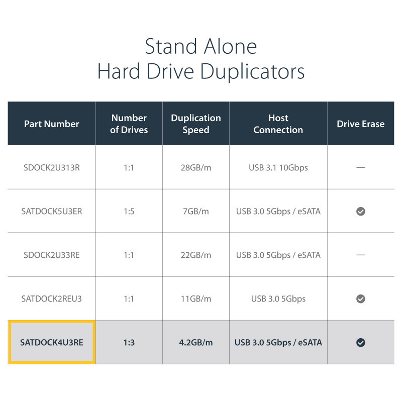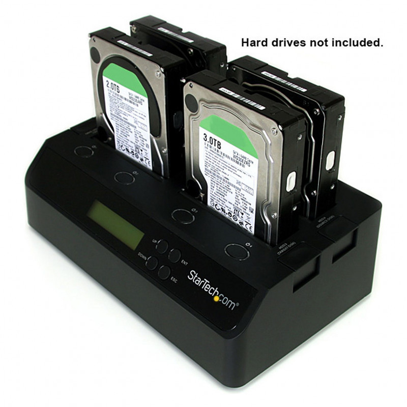 "StarTech.com 4 Bay USB 3.0 eSATA to SATA Standalone 1:3 HDD Hard Drive Duplicator Dock. Product type: HDD duplicator, Number of simultaneous copies: 3 copies, Interface: USB/eSATA. Supported HDD sizes: 2.5,3.5"", Supported HDD interfaces: Serial ATA, Serial ATA II. Compatible operating systems: Windows 2000/ XP(32/64-bit)/ Server 2003(32/64-bit)/ Vista(32/64-bit)/ 7(32/64-bit)/ Server 2008.... Power consumption (typical): 78 W, AC input voltage: 110-240 V, Output voltage: 12 V. Dimensions (WxDxH): 285 x 170 x 94 mm, Weight: 1.1 kg"\n"Quad Bay Hard Drive Duplicator & Eraser 2.5/3.5"" HDD/SSD Disk Cloner