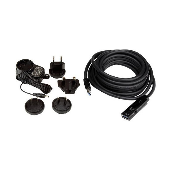 An all in one cable for overcoming distance restrictions as well as power source limitations; the active USB 3.2 Gen 1 extension cable incorporates bus powered active circuitry to ensure performance beyond the length limits of standard USB cables. Up to 4 of these cables can be daisy-chained together, allowing the connection to be extended a total of 20-meters. If necessary, the USB device can be powered from a wall outlet using the Universal AC power adapter provided with the cable.
