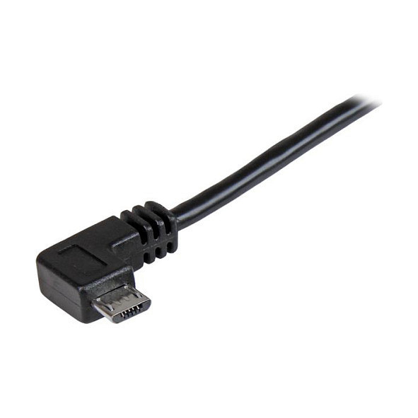 "StarTech.com Micro-USB Charge-and-Sync Cable M/M - Right-Angle Micro-USB - 24 AWG - 0.5 m. Cable length: 0.5 m. Connector 1: USB A, Connector 2: Micro-USB A, USB version: USB 2.0, Connector gender: Male/Male, Maximum data transfer rate: 0.48 Gbit/s, Connector contacts plating: Nickel, Product colour: Black"\n"This Micro-USB cable features 24 AWG wire to provide the full power you need to charge your mobile devices faster. The cable features a right-angled Micro-USB connector, so it’s great for charging your mobile devices in a car, or for accessing your mobile device while it’s connected to a car charger or computer.