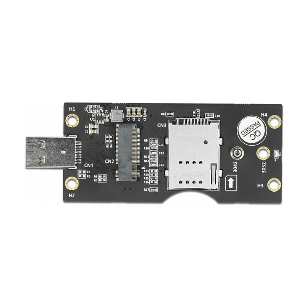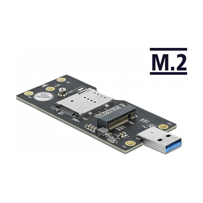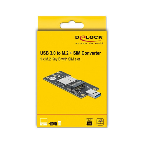 "DeLOCK USB 3.0 Converter Type-A male to M.2 Key B with SIM slot. Host interface: USB Type-A, Output interface: M.2. Product colour: Black. Width: 38 mm, Depth: 93 mm, Height: 6 mm. Package type: Hanging box"\n"This converter by Delock enables the connection of an M.2 module, e.g. GSM, GPRS, 3G, WLAN, LTE or 5G, in 2242, 2252, 3042 or 3052 format. The converter can be installed into the system through the USB interface."