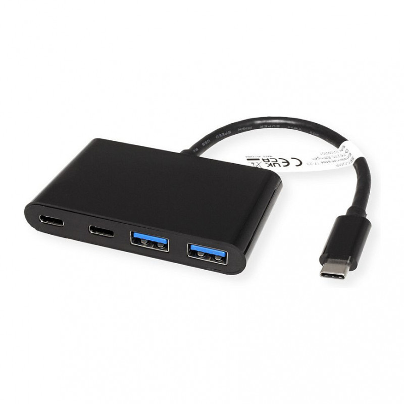 "VALUE 14.99.5041. Host interface: USB 3.2 Gen 1 (3.1 Gen 1) Type-C, Hub interfaces: USB 3.2 Gen 1 (3.1 Gen 1) Type-A, USB 3.2 Gen 1 (3.1 Gen 1) Type-C. Data transfer rate: 1000 Mbit/s, Product colour: Black, Housing material: Aluminium. Width: 76 mm, Depth: 46 mm, Height: 12.2 mm. Quantity per pack: 1 pc(s), Package width: 80 mm, Package depth: 60 mm"\n"With this USB 3.1 / USB 3.2 Gen 2 Hub up to four USB peripheral devices can be connected to the USB port of a PC.