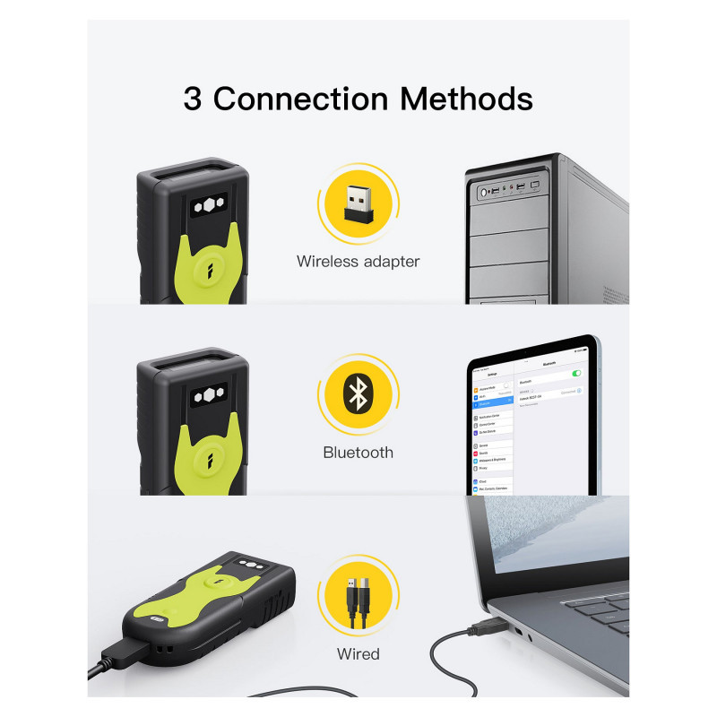 Shortcut buttons: Unlike most scanners, this scanner allows you to press the shortcut buttons to set the frequently used functions such as pairing via Bluetooth/2.4G, entering/exiting inventory mode and checking battery level.