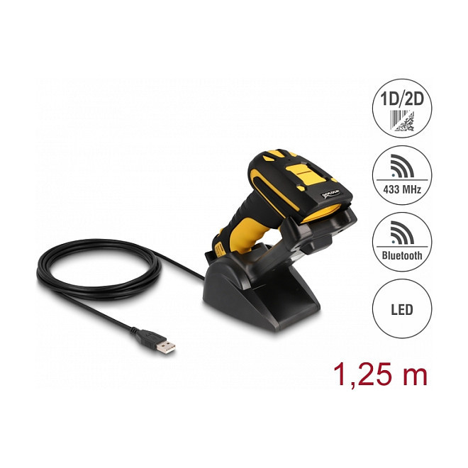 "DeLOCK Industrial Barcode Scanner 1D and 2D for 433 MHz or Bluetooth with inductive charging station. Type: Handheld bar code reader, Scanner type: 1D/2D, Sensor type: CMOS. Connectivity technology: Wireless, Standard interfaces: Bluetooth, RF Wireless, Wireless range: 10 m. Product colour: Black, Yellow, Internal memory: 16 MB, Country of origin: China. Power source type: Battery, Battery technology: Lithium Polymer (LiPo), Battery capacity: 1800 mAh. Weight: 321 g, Width: 100 mm, Depth: 185 mm"\n"This barcode scanner by Delock can be wirelessly connected to a PC, laptop or directly to a mobile phone or tablet. All common 1D and 2D barcode types can be precisely captured even at long distances. Additionally, the scanner recognizes barcodes displayed on displays and monitors.