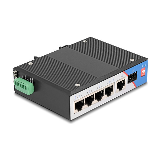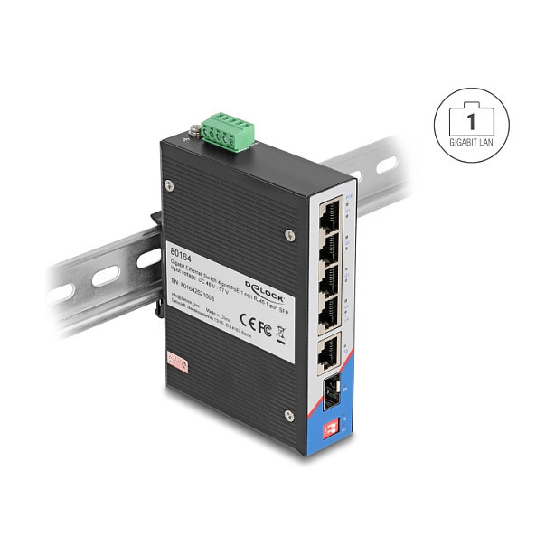 "DeLOCK 80164. Basic switching RJ-45 Ethernet ports type: Gigabit Ethernet (10/100/1000), Basic switching RJ-45 Ethernet ports quantity: 5. Networking standards: IEEE 802.3, IEEE 802.3ab, IEEE 802.3af, IEEE 802.3at, IEEE 802.3u, IEEE 802.3z. Power connector: Terminal block (5-pin). Power over Ethernet (PoE). Form factor: DIN rail"\n"This robust, industry capable Gigabit Ethernet switch by Delock can be used to connect different network components. The four RJ45 ports support Power over Ethernet according to IEEE802.3af / 802.3at, so they can supply power to PoE-enabled devices, such as an IP camera or a PoE splitter via the network cable. The additional SFP slot allows to expand the network with a fiber optic connection.