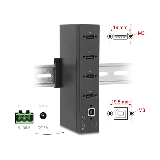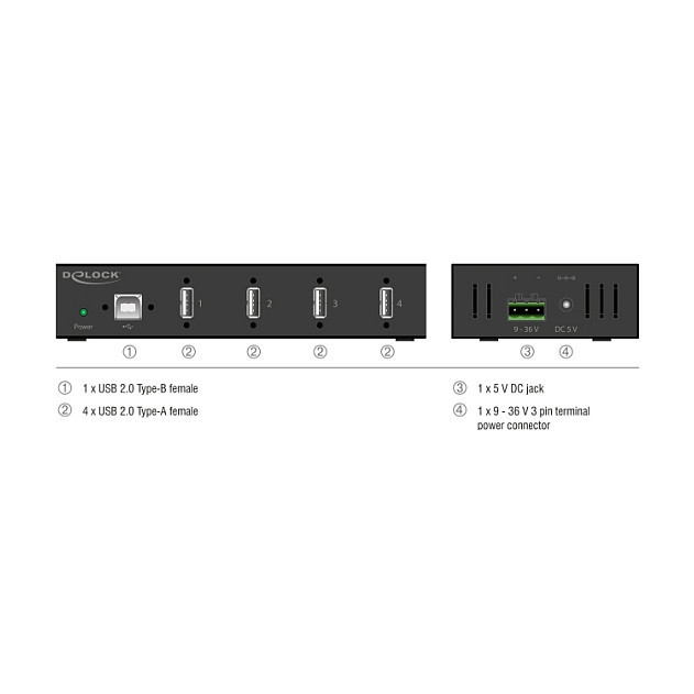 "DeLOCK 60686. Host interface: USB 2.0 Type-B, Hub interfaces: USB 2.0 Type-A. Data transfer rate: 480 Mbit/s, Product colour: Black, Housing material: Metal. Power supply type: DC. Windows operating systems supported: Windows 10, Windows 10 x64, Windows 11, Mac operating systems supported: Mac OS 13.1, Mac OS X 14.0 Sonoma, Mac OS X 15.0 Sequoia, Linux operating systems supported: Linux Kernel 6.2, Linux Kernel 6.5. Width: 80 mm, Depth: 158 mm, Height: 32 mm"\n"This solid industry capable USB Hub by Delock can be connected to a computer via the USB Type-A interface. It expands the computer by four USB Type-A connectors.