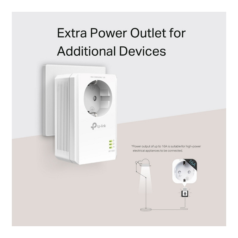 "TP-Link TL-PA7017P. Maximum data transfer rate: 1000 Mbit/s, Networking standards: IEEE 1901, IEEE 802.3, IEEE 802.3ab, IEEE 802.3u, Ethernet LAN interface type: Gigabit Ethernet. Power consumption (typical): 2.3 W, Power consumption (standby): 0.5 W, AC input voltage: 220 V. Product colour: White. Width: 95 mm, Depth: 58 mm, Height: 72 mm. Compliance certificates: RoHS"\n