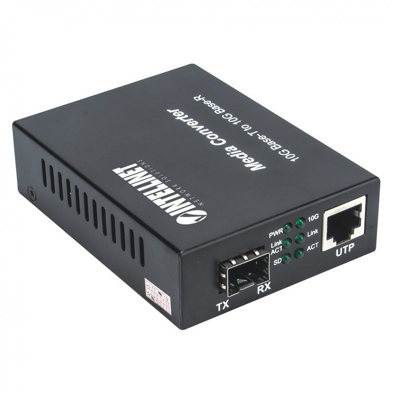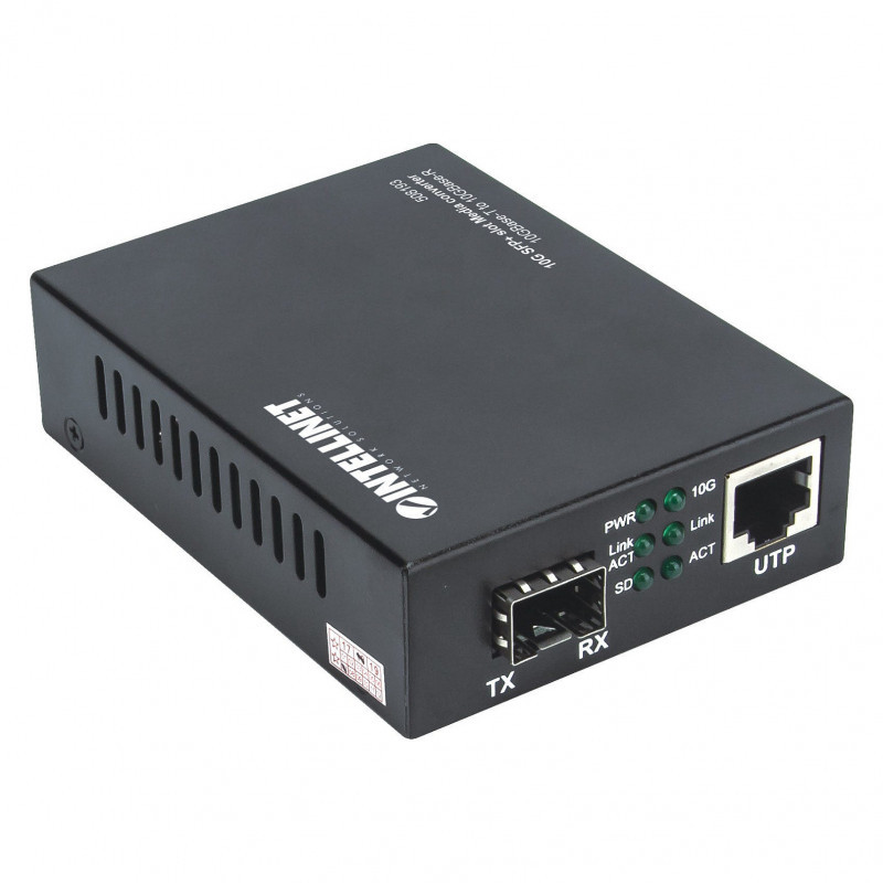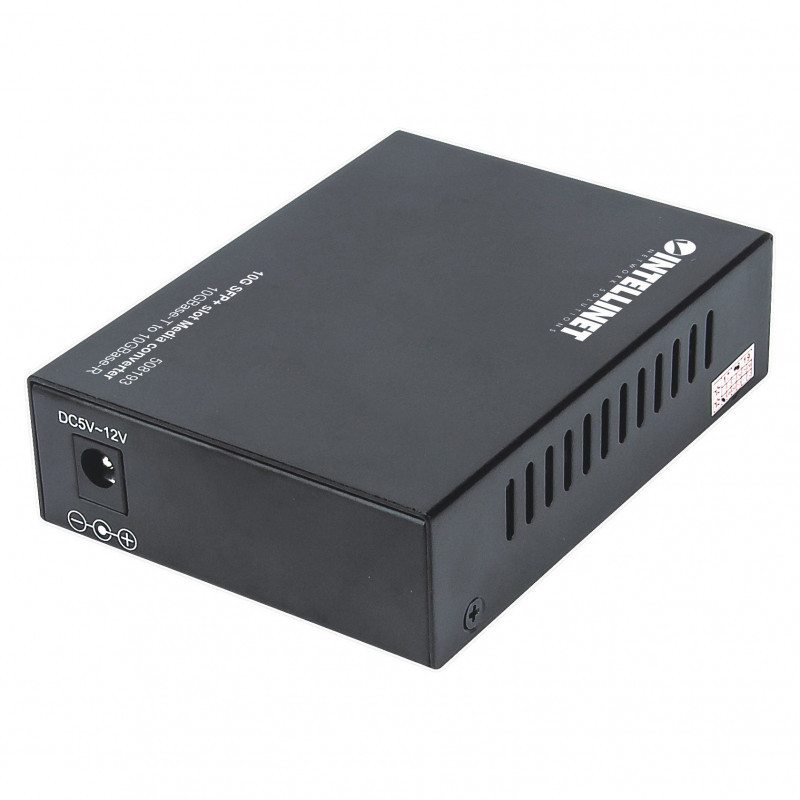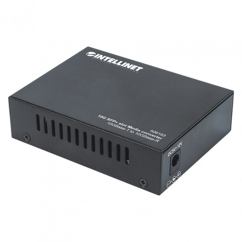 "Intellinet 10GBase-T to 10GBase-R Media Converter, 1 x 10 GB SFP+ Slot, 1 x 10GB RJ45 Port. Maximum data transfer rate: 10000 Mbit/s, Networking standards: IEEE 802.3u, Ethernet interface type: 10 Gigabit Ethernet. Maximum transfer distance: 100 m. LED indicators: Activity, Link, Product colour: Black, Housing material: Metal. Fiber optic connector: SFP+, Connectivity technology: Wired. Input voltage: 12 V, Input current: 0.5 A, Power consumption (max): 5 W"\n"The Intellinet Network Solutions 10GBase-T to 10GBase-R Media Converter offers the network designer a device for migration from copper-based Ethernet to Fibre Ethernet. Now, migration or expansion of existing networks can be achieved with minimum cost and complexity. The converter is completely transparent to the network, so the network performs exactly the way it did before, only now it can support both copper and Fibre media. And with a super-fast 10 Gbps connection, network speed stays constant for high-bandwidth data transfers._x000D_