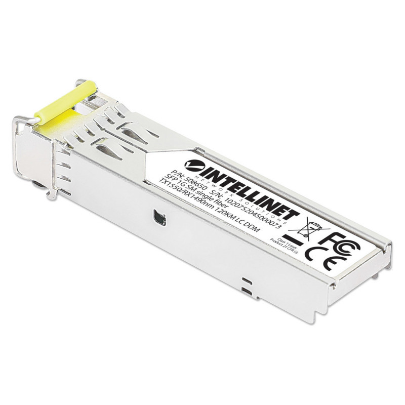 "Intellinet Gigabit Fiber WDM Bi-Directional SFP Optical Transceiver Module 1000Base-BX-D (LC) Single-Mode Port, 120 km (75 mi.), BiDi WDM (RX1490/TX1550), MSA-compliant for Maximum Compatibility, Silver. SFP transceiver type: Fiber optic, Maximum data transfer rate: 1000 Mbit/s, Interface type: mini-GBIC/SFP. Product colour: Silver, Housing material: Metal, Brand compatibility: MSA Compliant. Maximum voltage: 3.3 V, Power consumption (typical): 1 W. Compliance certificates: CE, RoHS, Federal Communications Commission (FCC). Width: 14 mm, Depth: 57 mm, Height: 12 mm"\n"Gigabit Fiber WDM Bi-Directional SFP Optical Transceiver Module – MSA compatible, affordable premium performance with WDM benefits