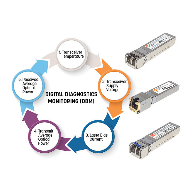 This transceiver supports standard digital diagnostics monitoring (DDM) functions, also known as digital optical monitoring (DOM). That gives the user the ability to monitor parameters of the SFP, such as optical output power, optical input power, temperature, laser bias current, and transceiver supply voltage, in real time.