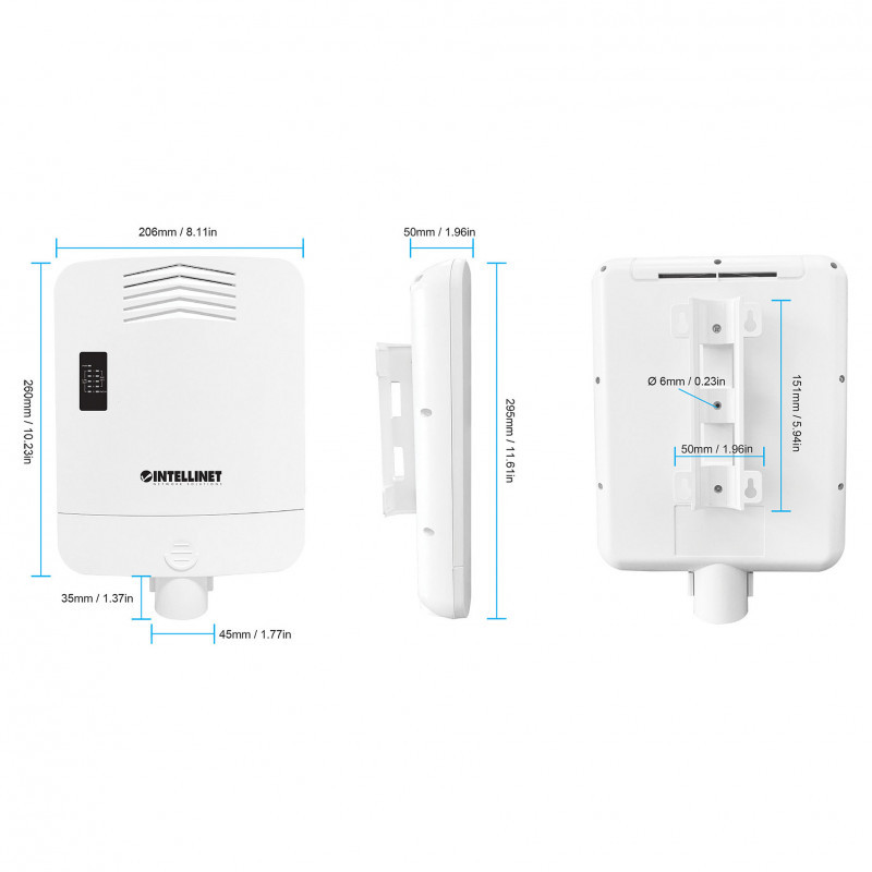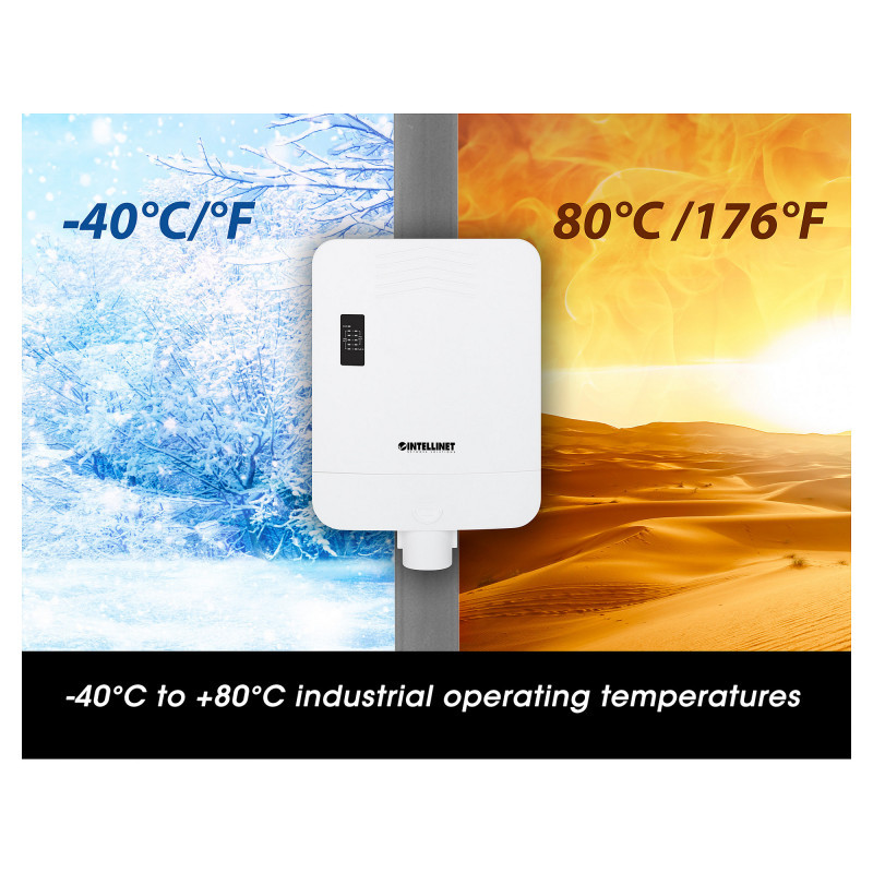 "Intellinet Outdoor PoE-Powered 5-Port Gigabit Switch with PoE Passthrough / 4-Port PoE+ Extender. Basic switching RJ-45 Ethernet ports type: Gigabit Ethernet (10/100/1000), Basic switching RJ-45 Ethernet ports quantity: 5. MAC address table: 2000 entries, Switching capacity: 10 Gbit/s. Networking standards: IEEE 802.3, IEEE 802.3ab, IEEE 802.3af, IEEE 802.3at, IEEE 802.3bt, IEEE 802.3u, IEEE 802.3x. Power over Ethernet (PoE)"\n"Waterproof Outdoor PoE Switch with extra-high range and no need for AC power thanks to PoE Passthrough - great for network cameras