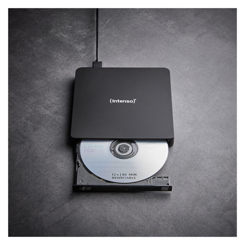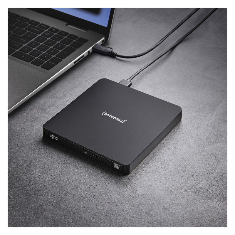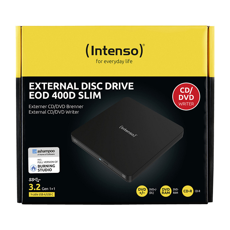 "Intenso EOD 400D Slim. Product colour: Black, Disc loading type: Front. Purpose: Desktop/Laptop, Optical drive type: DVD Super Multi DL, Interface: USB 3.2 Gen 1 (3.1 Gen 1). CD write speed: 24x, DVD+R write speed: 8x, DVD-R write speed: 8x. Width: 142 mm, Depth: 148 mm, Height: 16 mm. Quantity per pack: 1 pc(s), Bundled software: Ashampoo Burning Studio"\n"Reliable external CD/DVD burner.