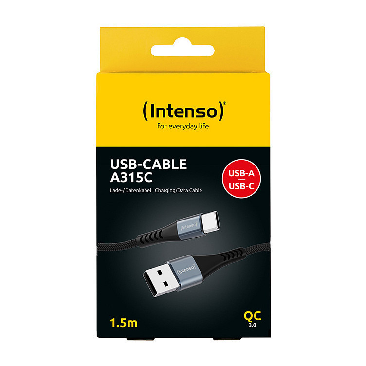 "Intenso A315C USB-C charging/data cable, 1.5m, fast charging up to 60 watts, black"\n"The Intenso A315C USB-C charging/data cable combines durability and performance in a sleek design. At 1.5 m in length, it’s perfect for versatile use at home, the office or on the go. With a USB‑A to USB‑C connection, it supports QC 3.0 fast charging up to 60 W while offering stable data transfer at 480 Mbps. Its premium nylon-aluminium jacket and reinforced strain relief areas ensure long-lasting, everyday reliability.