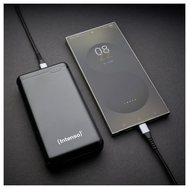 "Intenso XS20000. Battery capacity: 20000 mAh, Battery technology: Lithium Polymer (LiPo), Battery voltage: 3.1 V. USB Type-A output ports: 1, USB Type-C ports quantity: 1. Output current: 3.1 A. Product colour: Black"\n"Technical standards in a compact design