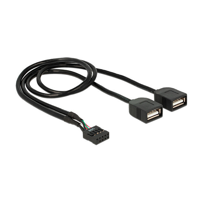 "DeLOCK 83823. Cable length: 0.4 m. Connector 2: 2 x USB A, USB version: USB 2.0, Connector gender: Female/Female, Maximum data transfer rate: 0.48 Gbit/s, Product colour: Black"\n"The Delock USB cable enables you to connect two USB devices with a USB-A interface to an internal pin header of the mainboard."