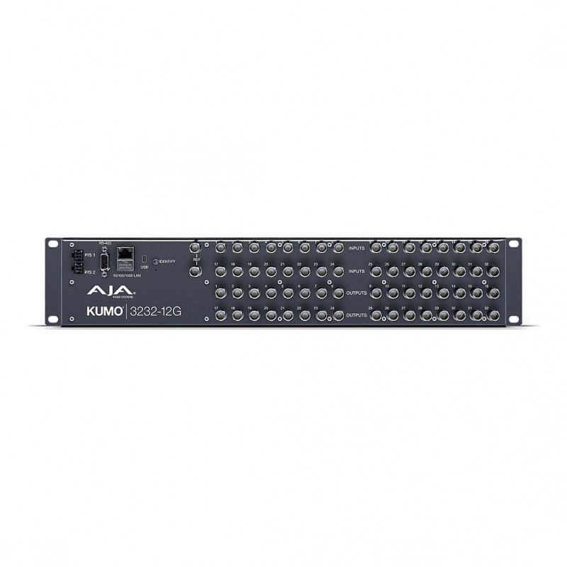 "AJA KUMO 3232-12G. Video port type: BNC. Product colour: Grey, Maximum operating distance: 405 m, Bandwidth: 12 Gbit/s. AC adapter input voltage: 100 - 240 V, AC adapter frequency: 50/60 Hz. Width: 442 mm, Depth: 38.1 mm, Height: 88.9 mm. Quantity per pack: 1 pc(s)"\n"KUMO 3232-12G offers increased capacity for larger configurations while maintaining a compact 2RU profile with support for 12G-SDI/6G-SDI/3G-SDI/1.5G-SDI with 32x 12G-SDI inputs and 32x 12G-SDI outputs.