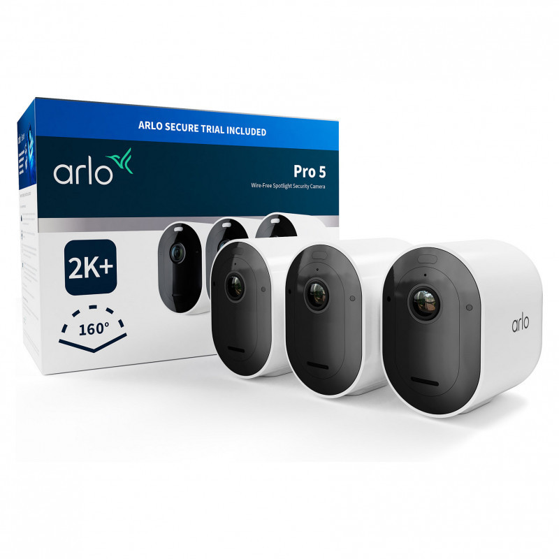 "Arlo Pro 5 2K+ Outdoor Security Camera, 3-cam. Type: IP security camera, Placement supported: Indoor & outdoor, Connectivity technology: Wired & Wireless. Mounting type: Ceiling/wall, Product colour: Black, White. Maximum resolution: 1440 x 2560 pixels, Total megapixels: 4 MP. Power source type: Battery. Packaging content: (3) Arlo Pro 5 Spotlight Camera (1) Wall Mount (3) Rechargeable Battery (1) Magnetic Charging..."\n"Capture more than 60 billion colours with our advanced 2K+ colour night vision that’s over 100X better than a human eye. Protect your home day and night and stream live videos, Or choose an Arlo Secure Subscription (sold separately) to save video clips in the cloud and look back at them anytime in the app.With up to 30% more battery life and dual band connectivity, instantly connect direct to any Wi-Fi router for 24/7 protection. And if you do spot intruders trigger the powerful spotlight that illuminates faces from 7m away or scare them off with the loud siren. Plus unlock Theft Protection Insurance with a Secure Subscription (sold separately) and if your camera is stolen we will replace it for free!