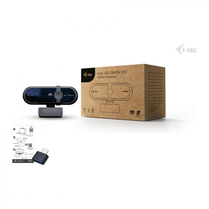 "i-tec SOLOMON 100 1080p Webcam. Megapixel (approx.): 2 MP, Maximum video resolution: 1920 x 1080 pixels, Camera HD type: Full HD. Interface: USB, Product colour: Black, Mounting type: Clip. Mobile operating systems supported: Android, iPadOS, iOS, Other operating systems supported: ChromeOS. Width: 95 mm, Depth: 61.4 mm, Height: 55.3 mm. Microphone pick-up range: 3 m"\n"The i-tec SOLOMON 100 is an affordable Full HD webcam designed for everyday video calls, online meetings, and home or office use. Thanks to a quality CMOS sensor and automatic image processing, it delivers natural colours and a stable image without any manual adjustment.