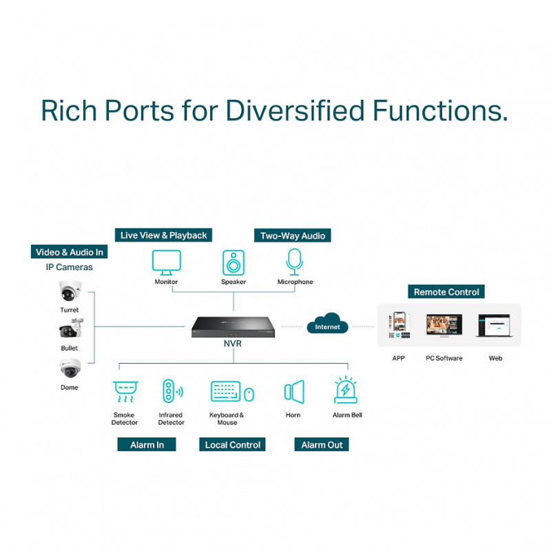 Equipped with a variety of ports, VIGI NVR4032H integrates 16× alarm in, 4× alarm out, two-way audio, video input, independent video output, and more, suitable for SMB surveillance scenarios.