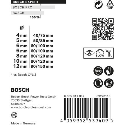 "Bosch 2 608 900 645. Proper use: Drill, Drill bit type: Centering drill bit, Suitable for materials: Concrete, Soft tile. Number of drill bits: 4 pc(s), Drill bit set included: Centering drill bit, Drill bit set sizes: 4/5/6/8 mm"\n"EXPERT CYL-9 MultiConstruction Drill Bit for Maximum Precision Drilling Multiple Materials