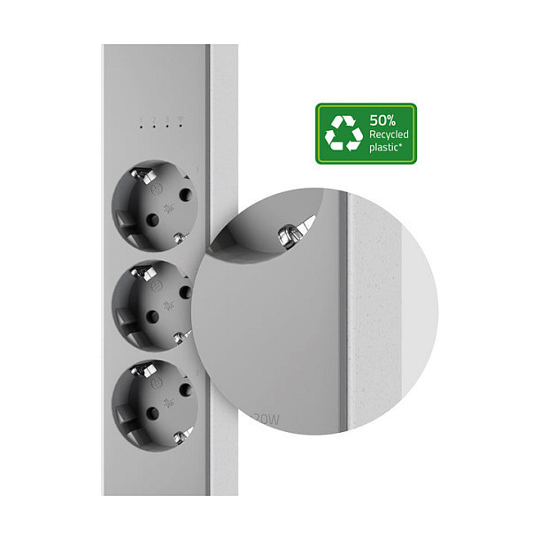 By selecting the Hombli Smart Powerstrip, you can start to reduce your carbon footprint through energy conservation and the choice of sustainable materials. The power strip's plastic body is composed of 50% recycled plastic, thus reducing plastic waste while delivering the elegance and simplicity of Hombli.