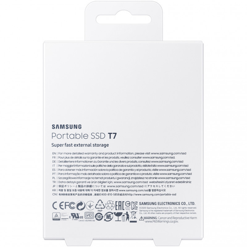"Samsung Portable SSD T7. SSD capacity: 1 TB. USB connector: USB Type-C, USB version: 3.2 Gen 2 (3.1 Gen 2). Read speed: 1050 MB/s, Write speed: 1000 MB/s. Password protection. Product colour: Grey"\n"Transfer in a flash