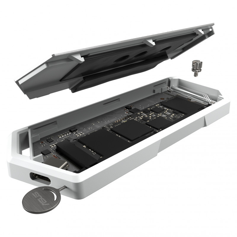 "ASUS ROG Strix Arion White Edition. Product type: SSD enclosure. Number of storage drives supported: 1, Storage drive size: M.2, Supported storage drive interfaces: M.2, PCI Express. Data transfer rate: 10 Gbit/s. Product colour: White. USB connector type: USB Type-C"\n"ROG Strix Arion M.2 NVMe SSD Enclosure—USB3.2 Gen 2x1 Type-C (10 Gbps), Dual USB-C to C and USB-C to A Cables, Screwdriver-Free, Thermal Pads Included, Fits PCIe 2280/2260/2242/2230 M key/B+M Key