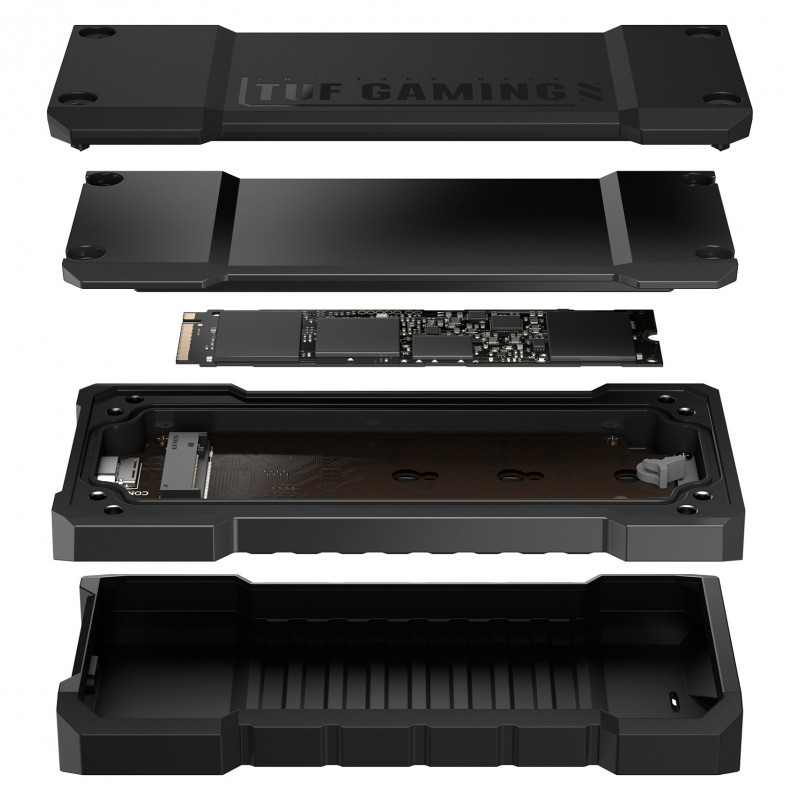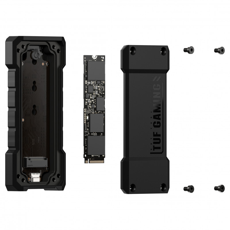 "ASUS TUF Gaming A2. Product type: SSD enclosure. Number of storage drives supported: 1, Storage drive size: M.2, Supported storage drive interfaces: PCI Express, Serial ATA, Maximum storage capacity: 4 TB. Data transfer rate: 20 Gbit/s. Product colour: Black"\n"TUF GAMING A2