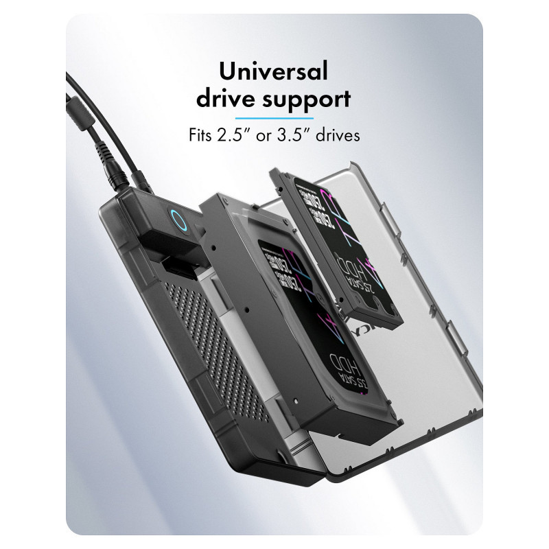 A dedicated power adapter keeps the enclosure running steadily, especially with larger 3.5″ hard drives. An LED indicator clearly shows power and drive activity: you easily see when the drive is in use. This makes monitoring transfers and backups more straightforward. All is under your control.
