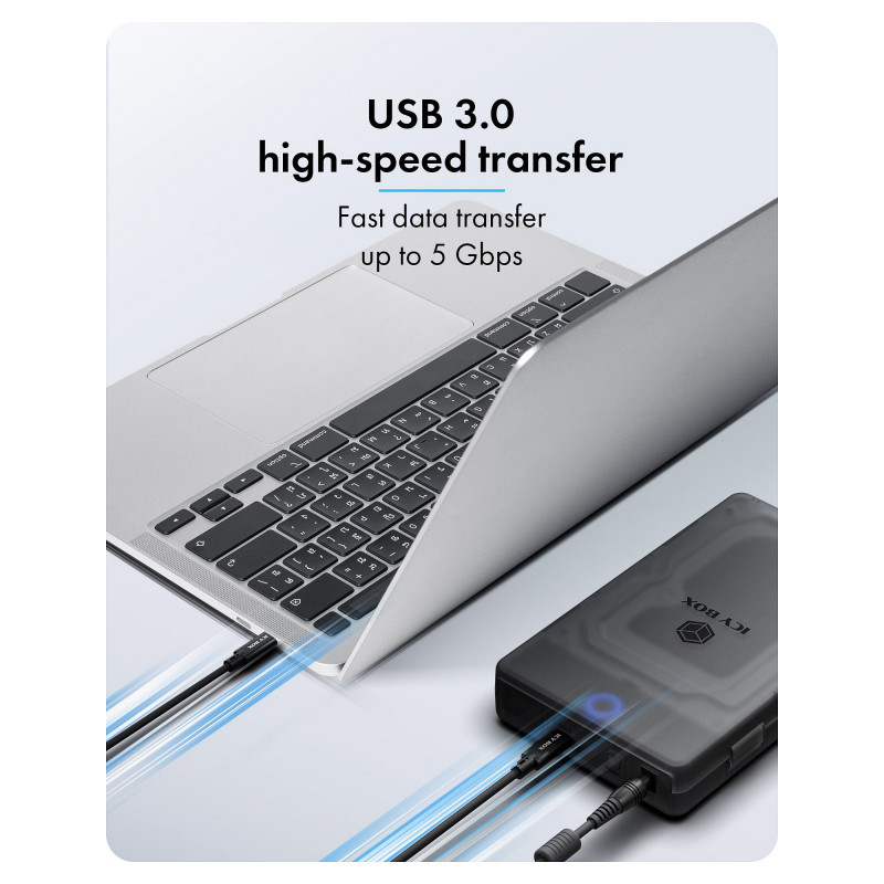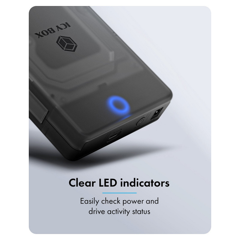 "ICY BOX Spade Base 388 Enclosure for 2.5""/3.5"" SATA SSD/HDD. Product type: HDD/SSD enclosure. Number of storage drives supported: 1, Storage drive size: 2.5/3.5"", Supported storage drive interfaces: Serial ATA, Serial ATA II, Serial ATA III, Maximum storage capacity: 30 TB. Data transfer rate: 5 Gbit/s. Hot-swap. Product colour: Black, Transparent. USB connector type: USB Type-C"\n"Ideal for data backup, management & recovery