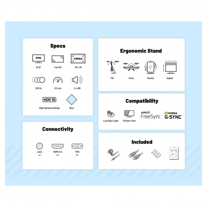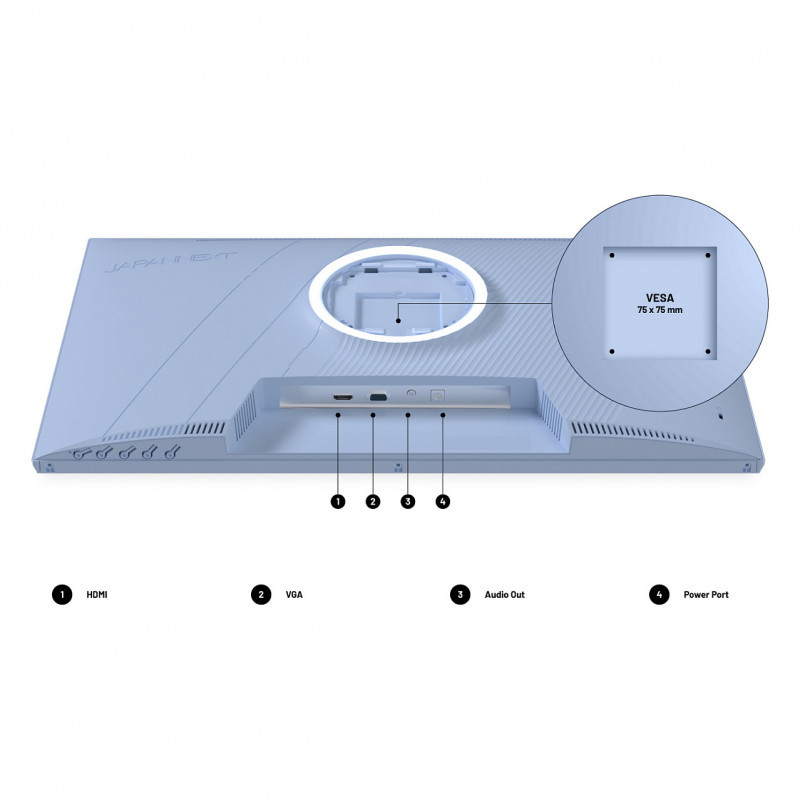 "JAPANNEXT JN-I238FHD120F-HSP-BB. Display diagonal: 60.5 cm (23.8""), Display resolution: 1920 x 1080 pixels, HD type: Full HD, Display technology: LCD, Display surface: Matt, Response time: 0.5 ms, Native aspect ratio: 16:9, Viewing angle, horizontal: 178°, Viewing angle, vertical: 178°. Built-in speaker(s). VESA mounting, Height adjustment. Product colour: Blue"\n"It is said that this monitor is as refreshing as a summer sky. Its light blue brings a touch of smoothness to your desktop, while its 120 Hz and fast response time ensure a smooth gaming experience. Ideal to combine style and efficiency!