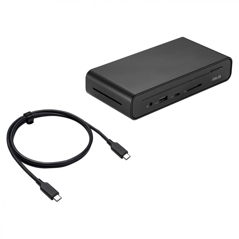 "ASUS Triple Display USB-C Dock Duo DC301. Connectivity technology: Wired, USB Power Delivery up to: 90 W. Ethernet LAN data rates: 1000 Mbit/s. Product colour: Black, Compatible memory cards: SD, Data transfer rate: 10 Gbit/s. Power source type: DC, Input current: 7.5 A, Power supply: 150 W. Width: 160 mm, Depth: 80 mm, Height: 32 mm"\n"Compact productivity magic