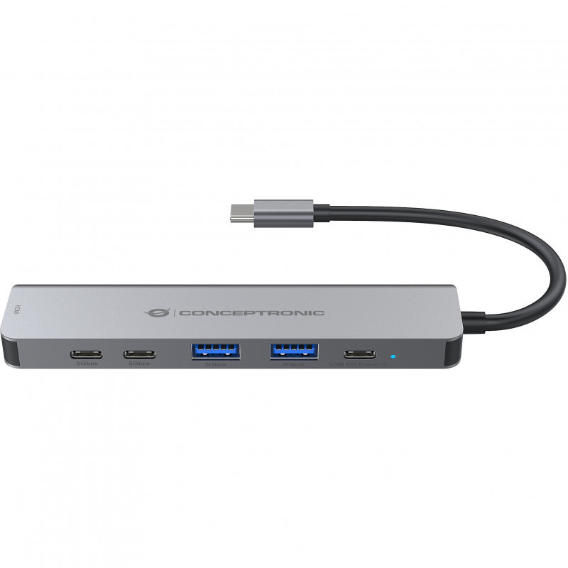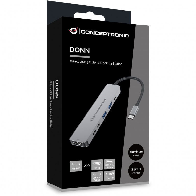 "Conceptronic DONN33G 6-in-1 USB 3.2 Gen 1 Docking Station, HDMI, USB-A 5Gbps x 2, USB-C 5Gbps x 2, 100W USB PD. Connectivity technology: Wired, Host interface: USB 3.2 Gen 1 (3.1 Gen 1) Type-C, USB Power Delivery up to: 100 W. Product colour: Silver, Data transfer rate: 5 Gbit/s, HD type: 4K Ultra HD. Power source type: USB, USB cable length: 0.25 m. Windows operating systems supported: Windows 10, Windows 10 Education, Windows 10 Education x64, Windows 10 Enterprise, Windows 10..., Mac operating systems supported: Mac OS X 10.10 Yosemite, Mac OS X 10.11 El Capitan, Mac OS X 10.12 Sierra, Mac OS X 10.13 High..., Mobile operating systems supported: Android 10.0, Android 11.0, Android 12.0, Android 13.0, Android 14.0, Android 5.0, Android 5.1,.... Width: 113.3 mm, Depth: 28 mm, Height: 10 mm"\n"Enhance your device’s USB-C capabilities with the 6-in-1 Docking Station, featuring HDMI, USB-C PD, USB-A (5Gbps), and USB-C (5Gbps) ports. Seamlessly connect USB-C-compatible laptops, tablets, or smartphones to an HDMI display and enjoy crisp 4K Ultra HD resolution at 30Hz. With data transfer speeds of up to 5Gbps, this docking station delivers reliable performance—perfect for streaming, presentations, multitasking, and everyday productivity."