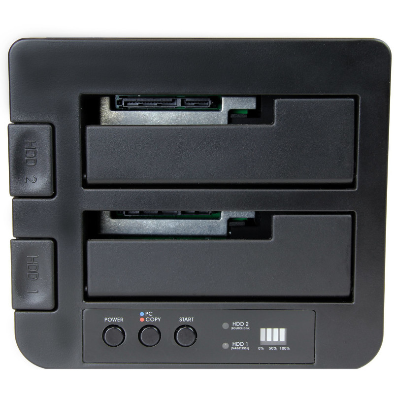 "StarTech.com Standalone Hard Drive Duplicator, Dual Bay HDD/SSD Cloner/Copier, USB 3.1 (10Gbps) to SATA III HDD/SSD Docking Station, Hard Disk Duplicator Dock, Hard Drive Cloner. Product type: HDD duplicator, Number of simultaneous copies: 2 copies, Interface: USB 3.1. Supported HDD sizes: 2.5,3.5"", Supported HDD interfaces: Serial ATA, Serial ATA II, Serial ATA III. Power consumption (typical): 36 W, AC input voltage: 100-240 V, Input current: 1.5 A. Dimensions (WxDxH): 132 x 142 x 70 mm, Weight: 508 g. Package width: 300 mm, Package depth: 166 mm, Package height: 88 mm"\n"Hard Drive Cloner | 2.5""/3.5"" HDD/SSD | USB 3.2 Gen 2 (10 Gbps) to SATA III