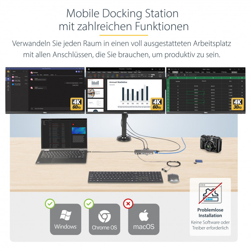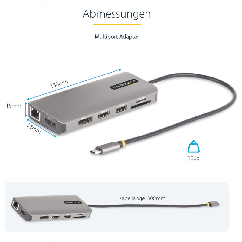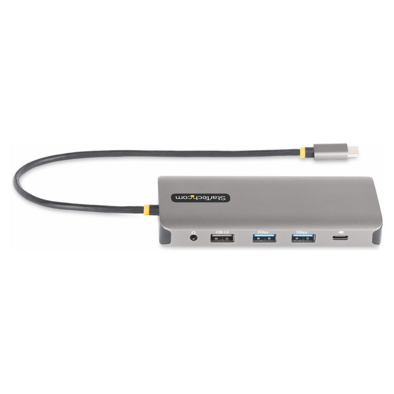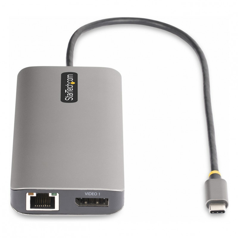 "StarTech.com USB-C Triple-Monitor Multiport Adapter, Dual 4K 60Hz + 4K 30Hz HDMI & DisplayPort, 4-Port USB Hub, 100W PD Pass-Through, GbE, SD/MicroSD Card Readers. Connectivity technology: Wired, Host interface: USB 3.2 Gen 1 (3.1 Gen 1) Type-C, USB Power Delivery up to: 100 W. Ethernet LAN data rates: 10,100,1000 Mbit/s, Networking standards: IEEE 802.3, IEEE 802.3ab, IEEE 802.3u. Product colour: Grey, Compatible memory cards: MicroSD (TransFlash), SD, Data transfer rate: 5 Gbit/s. Power source type: USB, Power consumption (typical): 15 W, USB cable length: 0.3 m. Windows operating systems supported: Windows 10, Windows 10 Education, Windows 10 Education x64, Windows 10 Enterprise, Windows 10..., Other operating systems supported: ChromeOS"\n"Create a workstation wherever you work with multiple displays, multiple USB ports, Gigabit Ethernet, and an SD slot