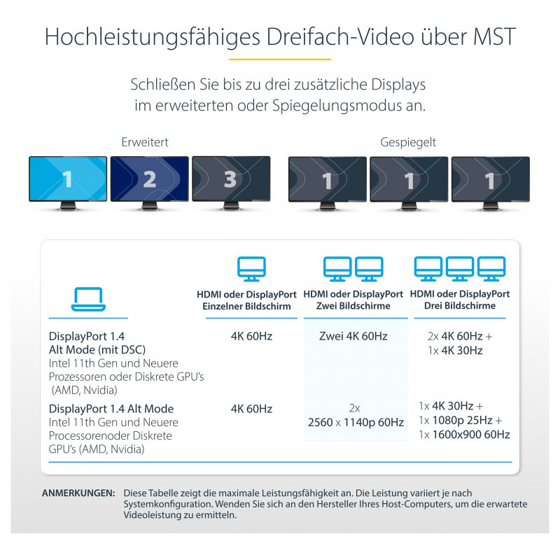 Video performance, such as resolution and refresh rate across all three monitors, is dependent upon the host computer's graphics processing unit (GPU). A source device with support for DisplayPort 1.4 with DSC and MST is required to achieve maximum performance. Please review the specifications the host computer and the monitors to determine expected video performance.
