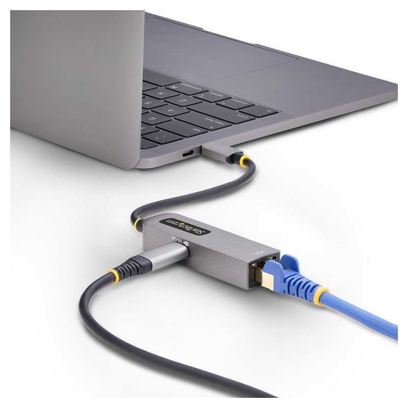 "StarTech.com USB-C to Ethernet Adapter, NIC, 100W PD Pass-Through, USB 3.0 Type-C 1Gbps Multi Speed Network Adapter, Thunderbolt Compatible, Windows & Mac. Connectivity technology: Wired, Host interface: USB Type-C, Interface: Ethernet. Maximum data transfer rate: 5000 Mbit/s. USB powered. Product colour: Grey"\n"Add Gigabit Ethernet network connectivity to a Laptop or Desktop Computer through a USB Type-C port