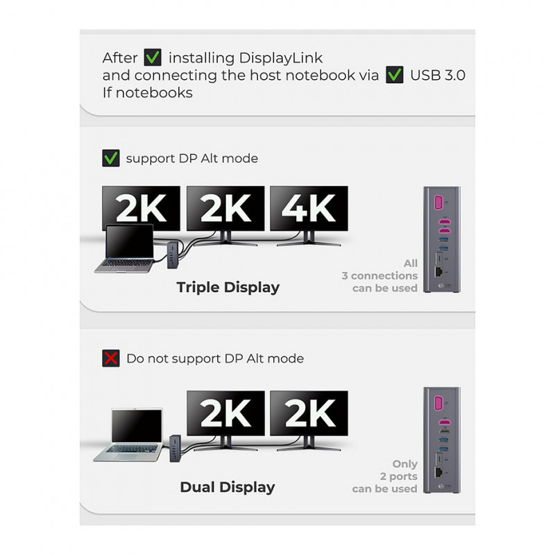 The IB-DK2262AC provides up to three video interfaces of different resolutions with two HDMI® and one VGA connection, enabling the simultaneous connection of HDMI® and VGA display devices in expansion mode. This is achieved by combining state-of-the-art technologies such as DisplayLink® and DisplayPort™ Alt Mode.