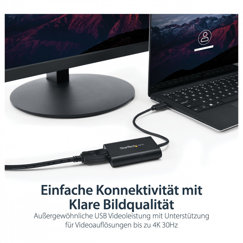 "StarTech.com USB 3.0 to DisplayPort Adapter, USB DP Monitor Converter for Windows, 4K (no support for macOS/ChromeOS/Linux) - TAA. USB version: 3.2 Gen 1 (3.1 Gen 1), USB connector type: USB Type-A, USB connector gender: Male. Product colour: Black, Housing material: Plastic. Windows operating systems supported: Windows 10, Windows 10 Education, Windows 10 Education x64, Windows 10 Enterprise, Windows 10..., Minimum processor family: Core i5, Minimum processor speed: 2.4 GHz. Width: 55 mm, Depth: 75 mm, Height: 16 mm. Package width: 144 mm, Package depth: 210 mm, Package height: 38 mm"\n"USB 3.0 External Video & Graphics Card | Multi-Monitor | USB-Powered | Supports Windows®