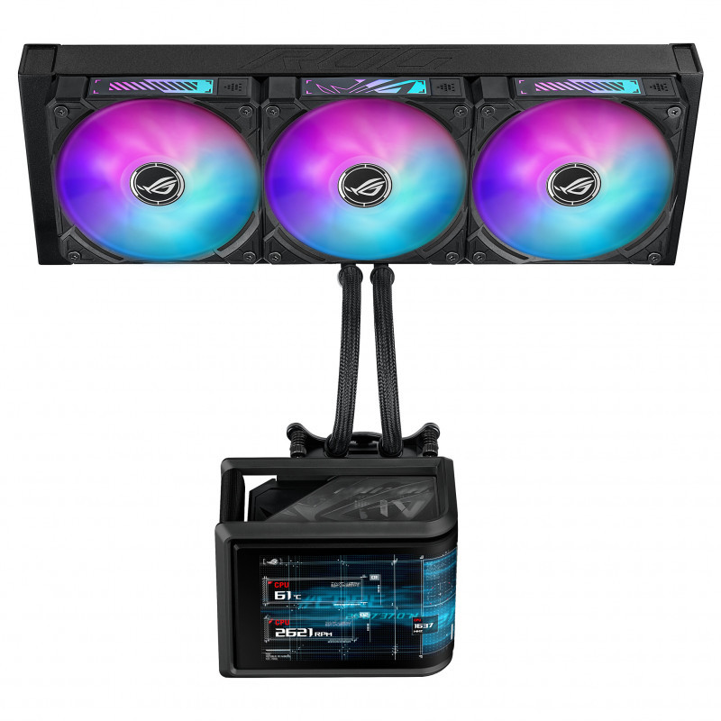 ROG Ryuo IV SLC 360 ARGB features a 6.67-inch AMOLED display, enabling intuitive control through dedicated software to smoothly display 3D videos, customized content, or hardware information. The innovative curved-screen design breaks the boundaries between the virtual and the real. The shorter 200mm tubing and a sliding LCD panel also reduce component obstruction, maximizing the visual experience. The powerful pump and ROG ARGB fans provide stable cooling performance for CPUs, including the AMD Ryzen™ 9000 series and Intel® Core™ Ultra processors."