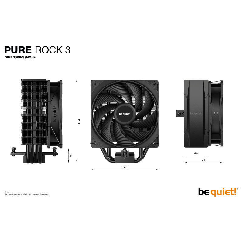 "be quiet! Pure Rock 3 Black. Type: Air cooler, Fan diameter: 12 cm, Rotational speed (max): 2000 RPM, Airflow: 101.2 m³/h, Maximum air pressure: 2.41 mmH2O, Bearing type: Rifle bearing. Width: 124 mm, Depth: 71 mm, Height: 154 mm. Product colour: Black"\n"Compact Performance for everyone