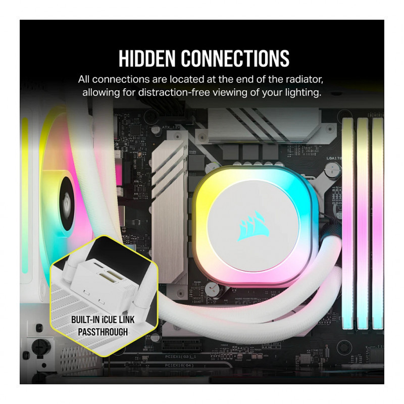 "Corsair H100I. Type: Hybrid cooler, Fan diameter: 12 cm, Rotational speed (min): 480 RPM, Rotational speed (max): 2400 RPM, Minimum air pressure: 0.17 mmH2O, Maximum air pressure: 3.8 mmH2O. Product colour: White"\n"iCUE LINK H100i RGB 240mm ALL-IN-ONE CPU COOLER